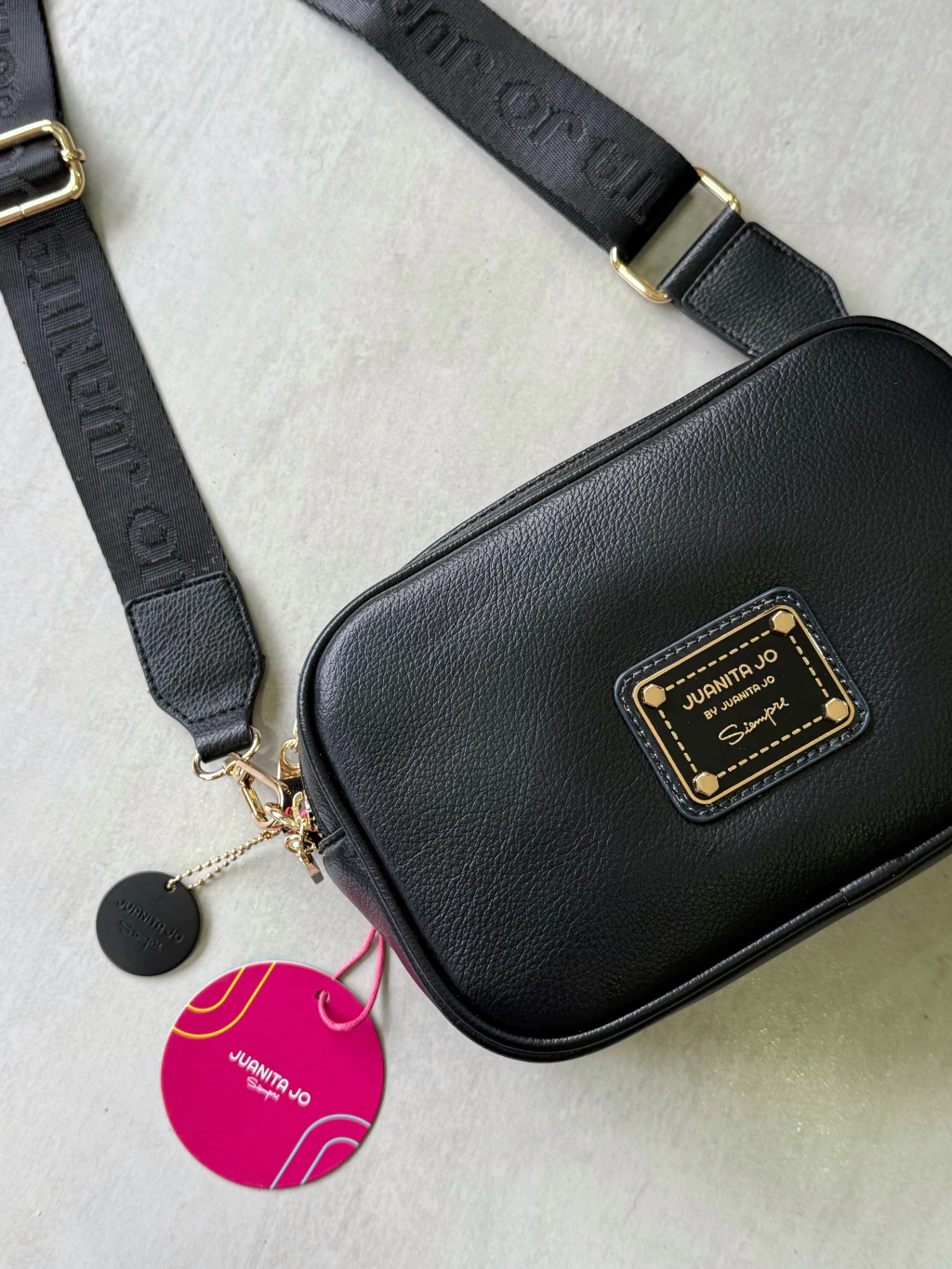 Además cuenta con la chapa metálica de Juanita Jo en el frente y tiene correa regulable con estampa personalizada.