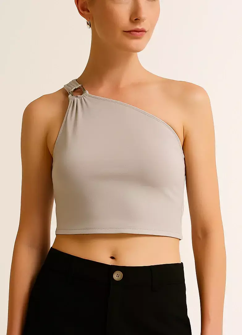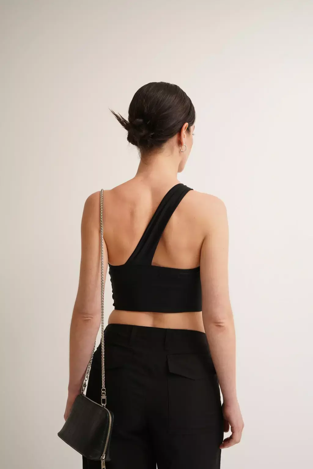 Top corto al cuerpo, con escote asimétrico a un hombro, con hebilla irregular en el bretel. Confeccionado en microfibra pesada, sin brillo, con el frente forrado con microfibra liviana.
