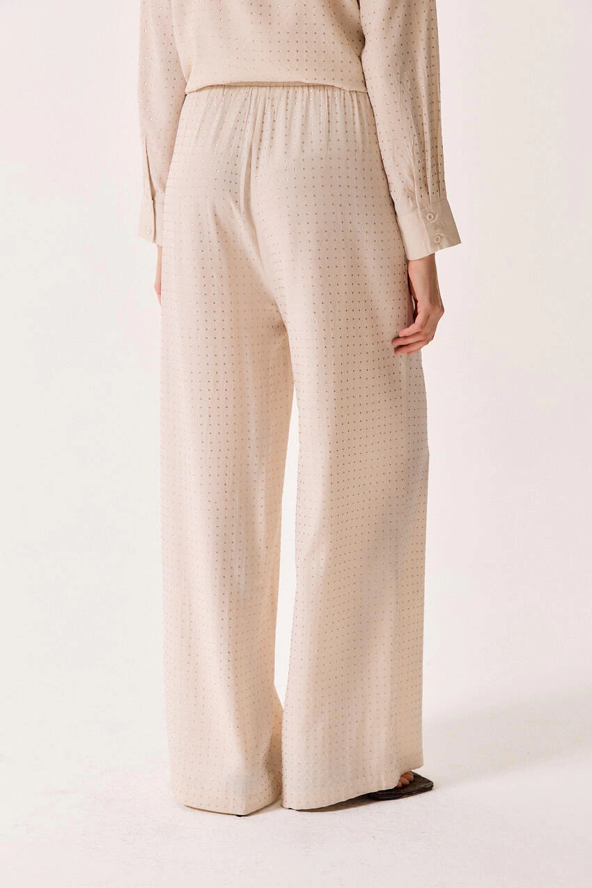 Pantalón palazzo de cristales hot fix, con cordón en la cintura. Composición: 65% viscosa 35% poliéster